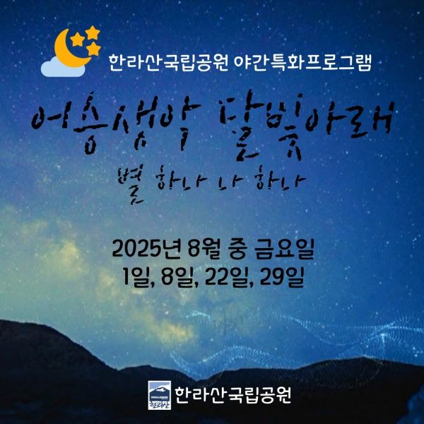 [한라일보] 제주특별자치도 세계유산본부 한라산국립공원관리소는 8월 야간 특화 프로그램 '어승생악 달빛 아래, 별 하나 나 하나'를 운영하다고 18일 밝혔다.