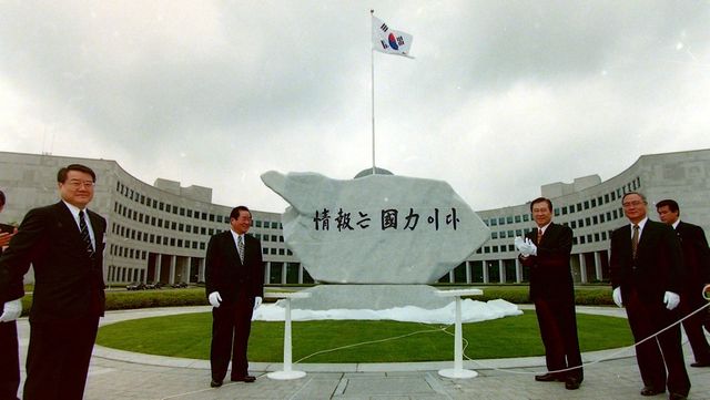 지난 1998년 당시 김대중 대통령이 국가안전기획부를 방문해 `국가정보원으로 명칭을 변경하며 `정보는 국력이다는 내용의 원훈석(院訓石)을 제막하는 사진. / 연합뉴스