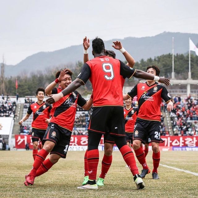 한국에서 뛰던 시절의 말컹. 골을 넣자 동료들이 축하하고 있다. / 말컹 인스타그램