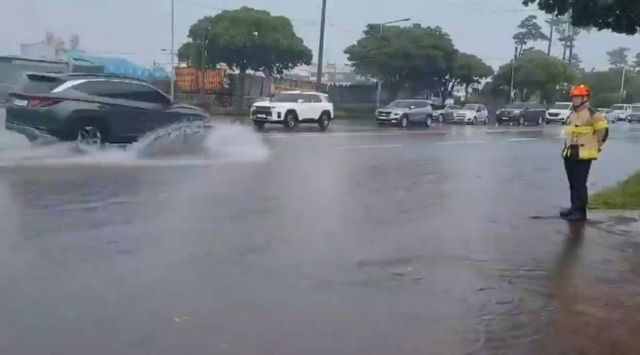 18일 오후 2시 22분쯤 제주시 연삼로 화북공업단지 앞에서는 도로가 침수돼 소방과 경찰이 출동했다. 제주소방안전본부 제공