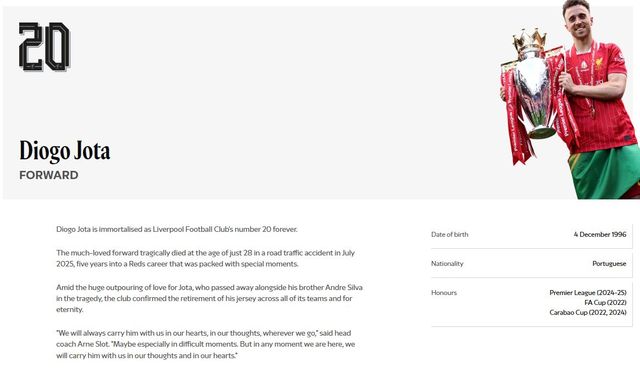 클럽은 해당 페이지에 조타의 생애와 리버풀에서의 활약을 기리는 글을 덧붙였다.