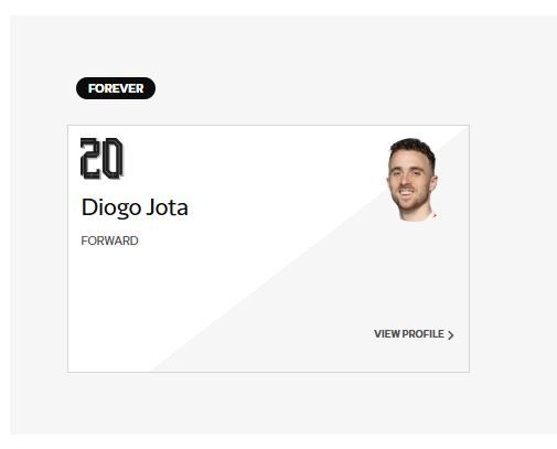 홈페이지 상단의 남자 1군 스쿼드 페이지에서 '공격수(forward)' 항목을 찾으면, 조타의 이름이 더 이상 다른 선수들과 동일한 방식으로 나열되지 않고, 별도의 항목 'forever' 아래 독립적으로 배치되어 있다.
