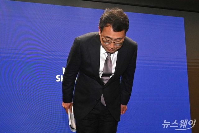 유영상 SK텔레콤 대표이사가 지난 4일 오후 서울 중구 SK텔레콤 본사에서 열린 사이버 침해 사고 관련 기자회견에 앞서 가입자들에게 허리 숙여 대국민 사과를 하고 있다. 사진=강민석 기자 kms@newsway.co.kr