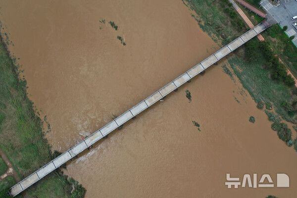 [서울=뉴시스] 18일 오후 광주 유일 6·25 전적지인 북구 옛산동교 아래 영산강으로 전날 내린 비로 인한 흙탕물이 흐르고 있다.