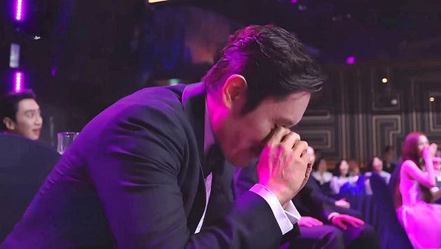 시상식 오프닝 무대에 자신의 댄스 영상이 등장하자 고개를 숙인 이병헌 / KBS '제4회 청룡시리즈어워즈'