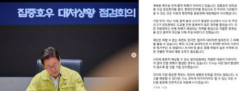 이 대통령은 이날 자신의 사회관계망서비스(SNS)를 통해 “집중호우 대처상황 긴급 점검회의를 열어 행정안전부를 중심으로 전 부처와 기관들이 쓸 수 있는 모든 자원과 행정력을 총동원해 대응해달라고 지시했다”고 했다.