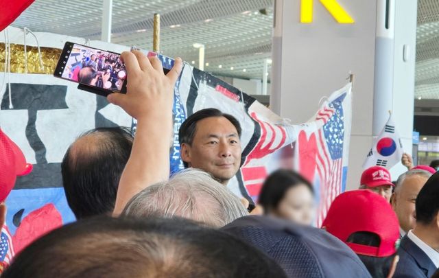 한국 방문을 마친 모스 탄 미국 리버티대 교수가 19일 오후 인천국제공항을 통해 미국으로 출국하며 지지자들에게 인사하고 있다. / 연합뉴스