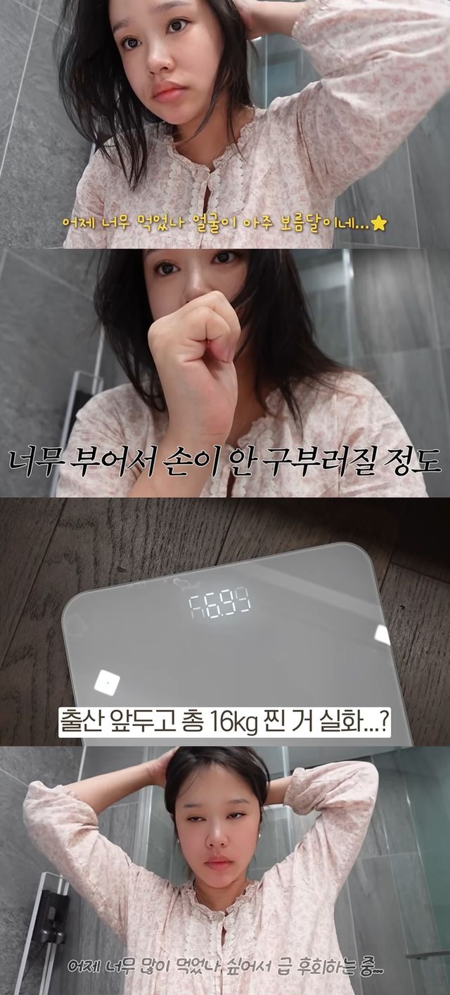 그는 "출산 앞두고 총 16kg찐 거 실화?"라는 자막으로 솔직한 모습을 전했다.