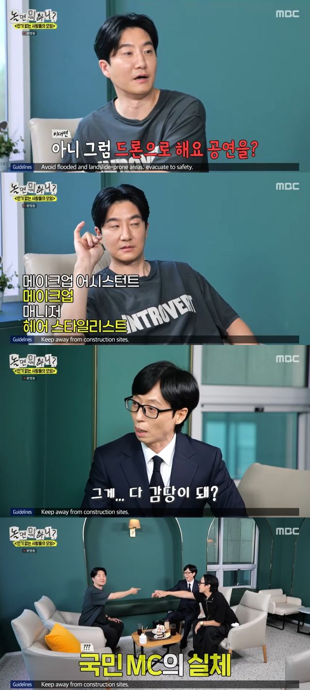 이에 투컷은 헤어스타일리스트, 매니저 동생, 메이크업, 메이크업 어시스턴트라고 설명했는데, 이에 유재석이 "그게 다 감당이 돼?"라며 묻자, 투컷은 "진짜 못됐다. 국민MC의 실체다"라고 말해 모두를 폭소케 했다.