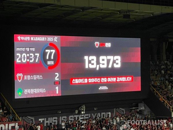 19일 오후 7시 포항스틸야드에서 하나은행 K리그1 2025 22라운드를 치른 포항이 전북현대와 2-2로 팽팽히 맞서고 있다.