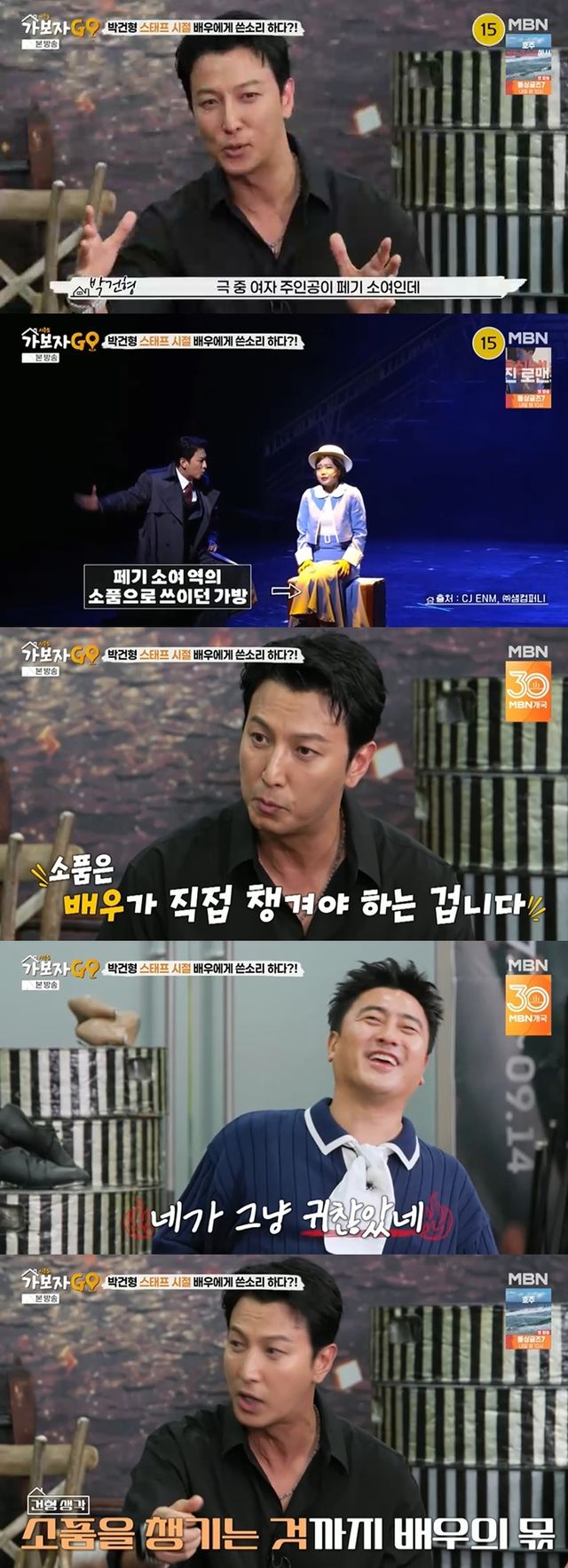 배우에게 조언을 했던 상황에 대해 박건형은 "극 중 여자 주인공이 페기 소여인데 페기 소여의 가방이 있다. 근데 그 분께서 '가방 좀 저쪽으로 갖다 놔주겠어요?'라고 해서 제가 '소품은 배우가 직접 챙겨야 하는 겁니다'라고 했다"고 회상했다.