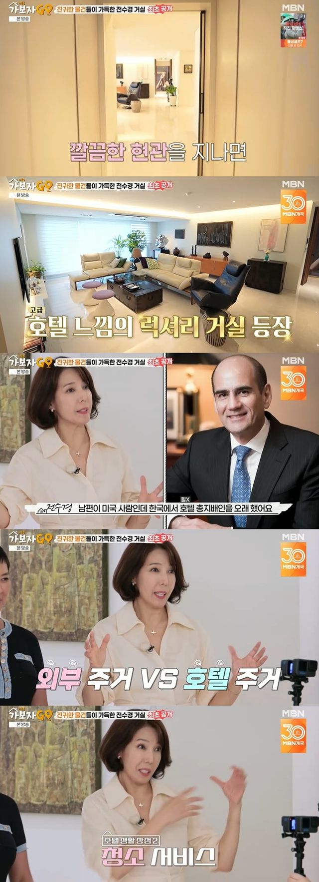 거실 한쪽에는 동서양 감성이 어우러진 다양한 미술 작품들이 전시돼 있었다. 전수경은 원래는 모델하우스처럼 깔끔한 집을 좋아했지만, 남편 때문에 호텔에서 오래 살았다고 밝혔다.