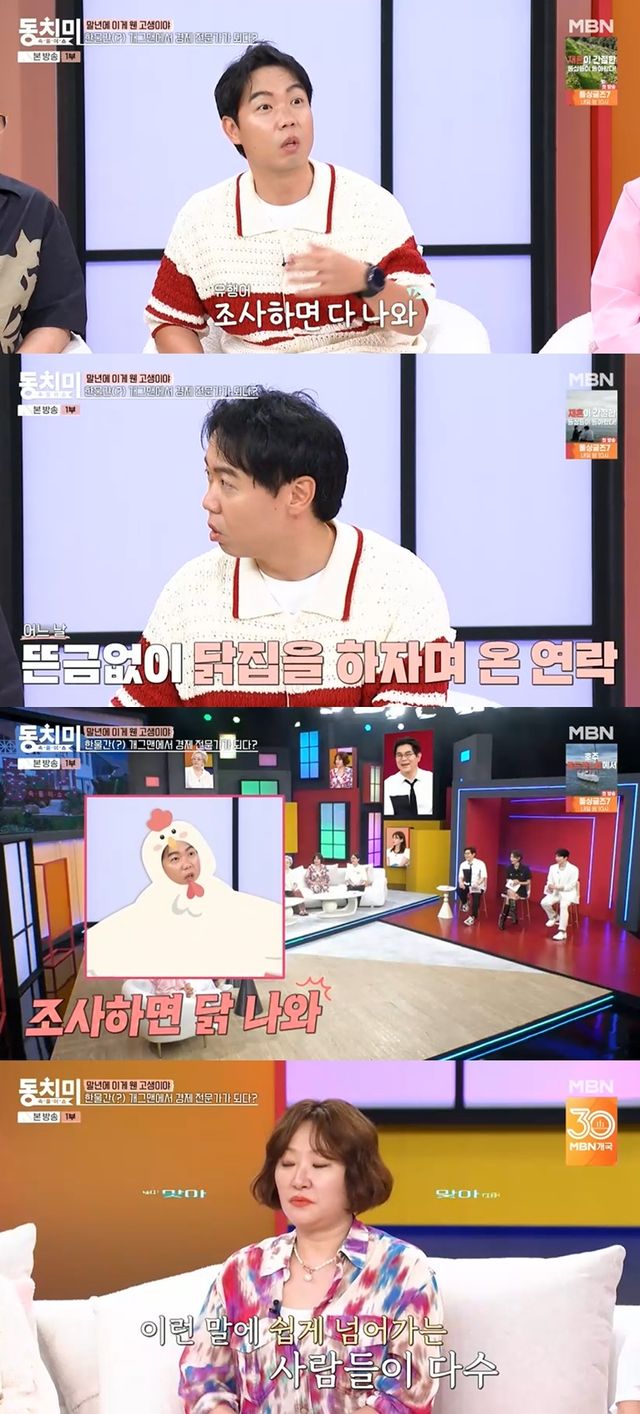 그는 "'개그콘서트'에서 범죄의 재구성이라는 코너를 했었다. '조사하면 다 나와' 이런 식으로 (유행어가 있었다)"며 "근데 닭집을 하자고 연락이 왔는데 닭집 이름이 '조사하면 닭 나와'라더라. 말도 안 되지 않냐. 근데 여기에 넘어가는 개그맨들이 거의 대부분"이라고 안타까움을 드러냈다.