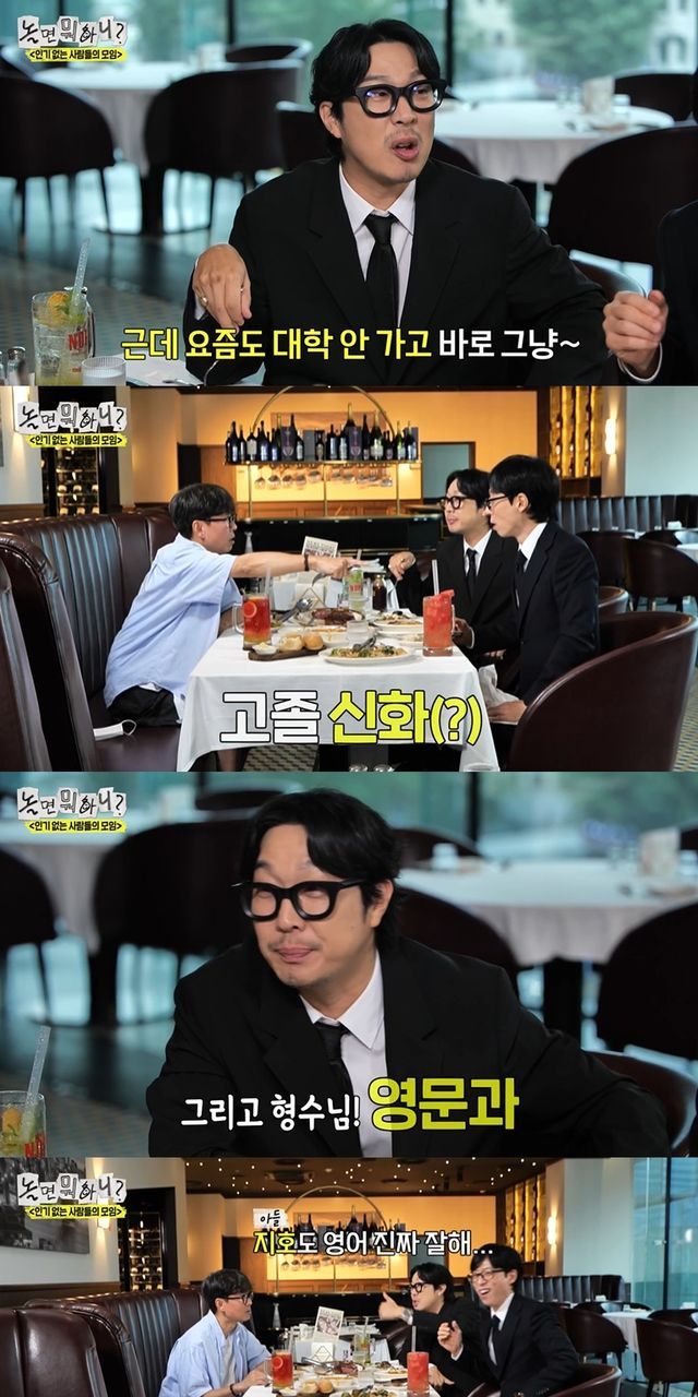 이를 들은 하하가 "요즘도 대학 안 가고 바로 그냥 실전으로 가기도 한다"고 하자 장항준은 유재석을 가리키더니 "여기 있잖아. 고졸 신화. 휼륭한 거다"라며 치켜세웠다.