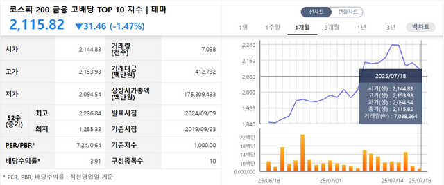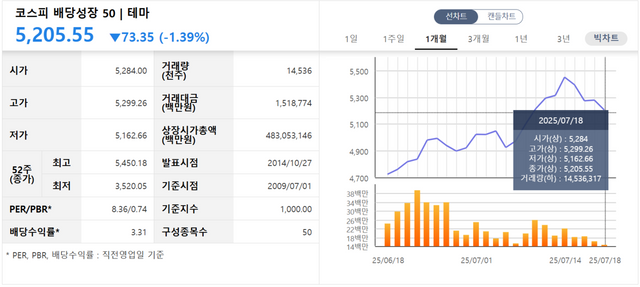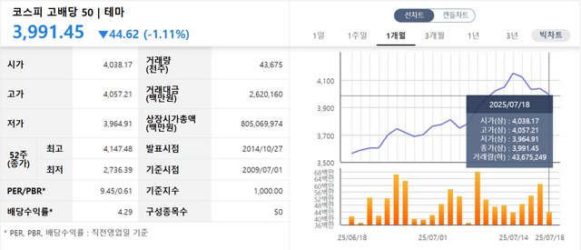 이처럼 배당소득 분리과세 제도 도입이 초미의 관심사로 떠오르면서, 배당주 등 수혜주 찾기도 빨라지고 있습니다. 이를 반영하듯 ‘코스피 200 금융 고배당 TOP 10 지수’는 최근 한 달(6월 18일~7월 18일) 사이에 15.89%, ‘코스피 배당성장 50’은 11.29%, ‘코스피 고배당 50’은 12.78% 뛰었습니다. 전체 테마 지수 34개 가운데 상승률 상위권을 달리고 있는 것입니다.