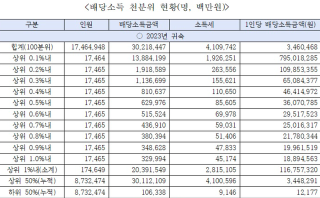 21일 차규근 의원실에 따르면, 가장 최근 자료인 2023년 기준 우리나라 국민 1746만4948명이 모두 30조2184억4700만원의 배당소득을 신고한 것으로 나타났습니다. 이 가운데 소득 상위 0.1%인 1만7464명은 총 13조8841억9900만원을 신고했습니다. 전체 배당소득의 절반 가까운(45.9%) 규모로, 차 의원은 “상위 극소수 자산가들에게 집중”됐다고 지적했습니다.