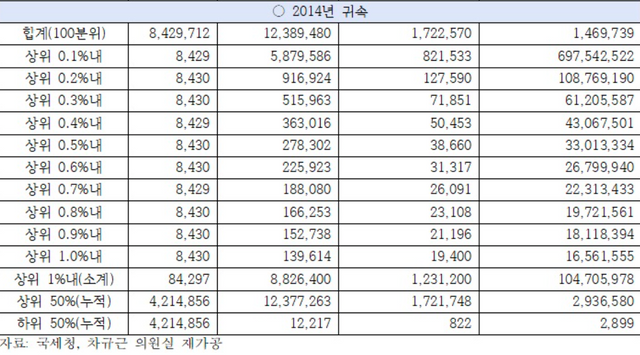 이들 상위 0.1%의 1인당 평균 배당소득은 7억9501만8285원이었지만, 하위 50%(873만2474명)는 1만2177원이었습니다. 앞서 2014년에는 842만9712명이 총 12조3894억8000만원을 신고했습니다. 당시 상위 0.1%(8429명)는 총 5조8795억8600만원을 신고, 전체의 47.5%를 차지했습니다. 10년 새 배당소득은 2배 가까이 늘었으나 ‘초부자 독식’ 구조는 바뀐 게 없습니다.