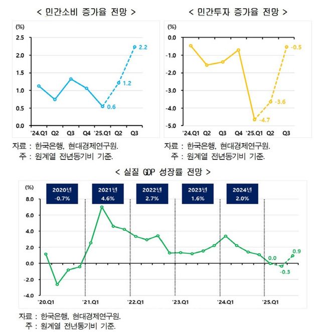 올해 2분기와 3분기에 심리지수가 오르면 민간소비 증가율은 2.2%로 늘고, 민간투자 감소폭은 05%로 줄어들 것으로 예상됐다.