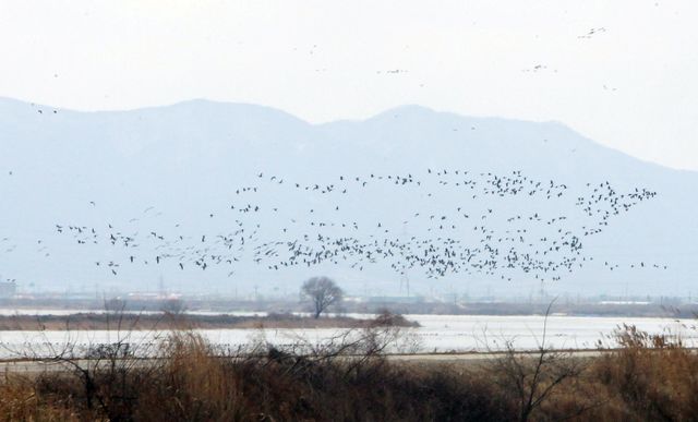 충남 당진시 우강면 부장리 삽교호 상공을 가창오리떼가 날아가고 있다. / 뉴스1
