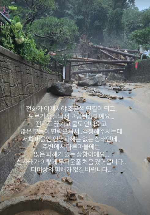 서효림은 “전기도 끊기고 물도 안 나오고 많은 분들이 연락오셔서 걱정해주신다. 우리 마을엔 인명피해는 없는 상태인데 주변 다른 마을에는 피해가 있는 상황이다. 산사태가 이렇게 무서운 줄 처음 겪어본다. 더이상의 피해가 없길 바란다”고 덧붙였다.