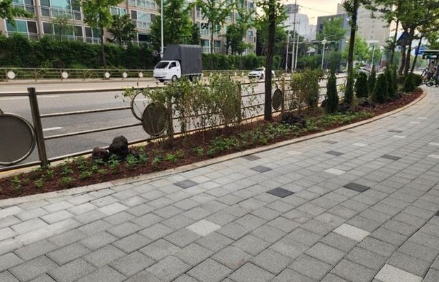 구는 또, 용인시 교통약자이동편의시설기술지원센터와 협의해 교통약자를 위한 점자블록과 보행자 안전지대도 설치했으며, 단조로운 보행환경의 미관을 개선하기 위해 적엽휴케라, 백리향, 라임라이트, 블루엔젤 등을 식재해 포켓정원을 조성했다.