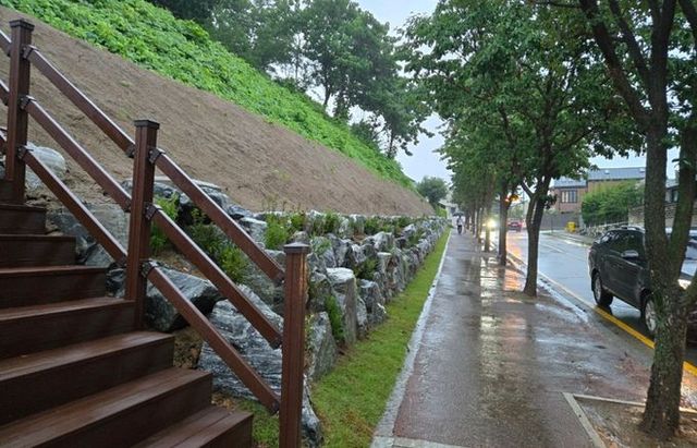 시는 공원 비탈면에서 흙과 모래가 인도로 흘러내리는 것을 방지하기 위해 비탈면 하부에 조경석을 쌓았다. 빗물이 원활히 흘러갈 수 있도록 배수로도 설치했다.