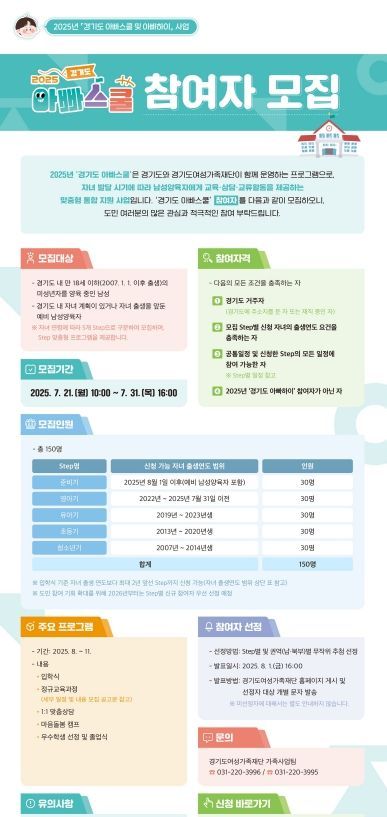 모집 대상은 도내 거주하거나 재직 중인 남성으로, 18세 이하(2007년 1월 1일 이후 출생)의 자녀를 양육 중이거나 자녀 계획 또는 출산을 앞둔 예비 남성양육자이다. 자녀 발달 단계에 따라 준비기, 영아기, 유아기, 초등기, 청소년기 5개 단계(Step)로 구분되며, 올해는 시범 사업으로 각 단계(Step)별 30명씩 총 150명 모집한다.