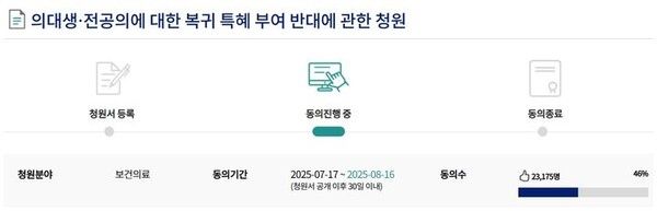 뉴시스 보도에 따르면, 20일 국회전자청원 홈페이지에 따르면 지난 17일 게재된 '의대생·전공의에 대한 복귀 특혜 부여 반대에 관한 청원' 게시글 동의자는 이날 오후 6시 기준 2만3175명을 기록했다.