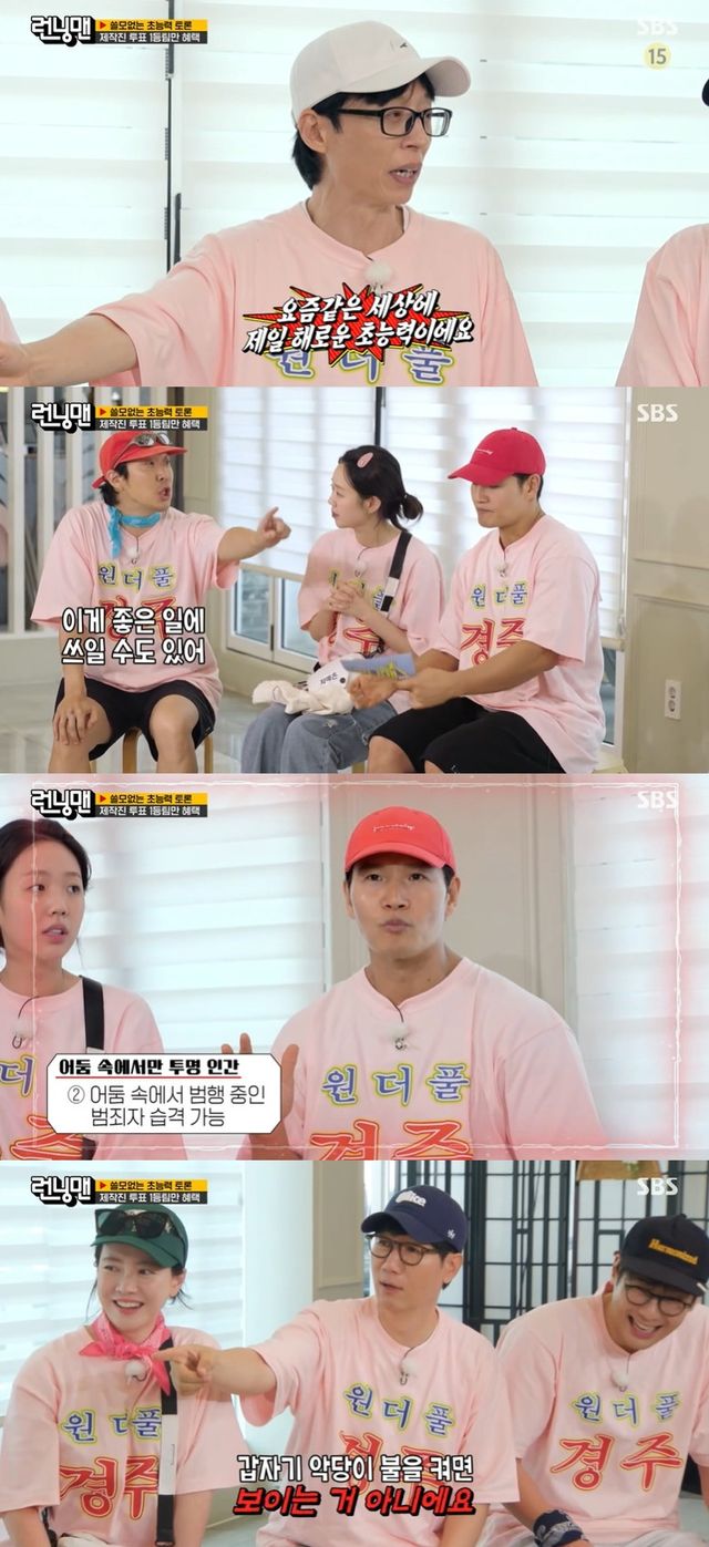 유재석도 "요즘 같은 세상에 제일 해로운 초능력"이라고 하자 김종국은 "범죄자가 어둠 속에서 인질을 잡고 있다거나 범죄를 저지르고 있을 때 몰래 가서"라며 좋은 일에 쓰일 수도 있는 경우를 예로 들었다.
