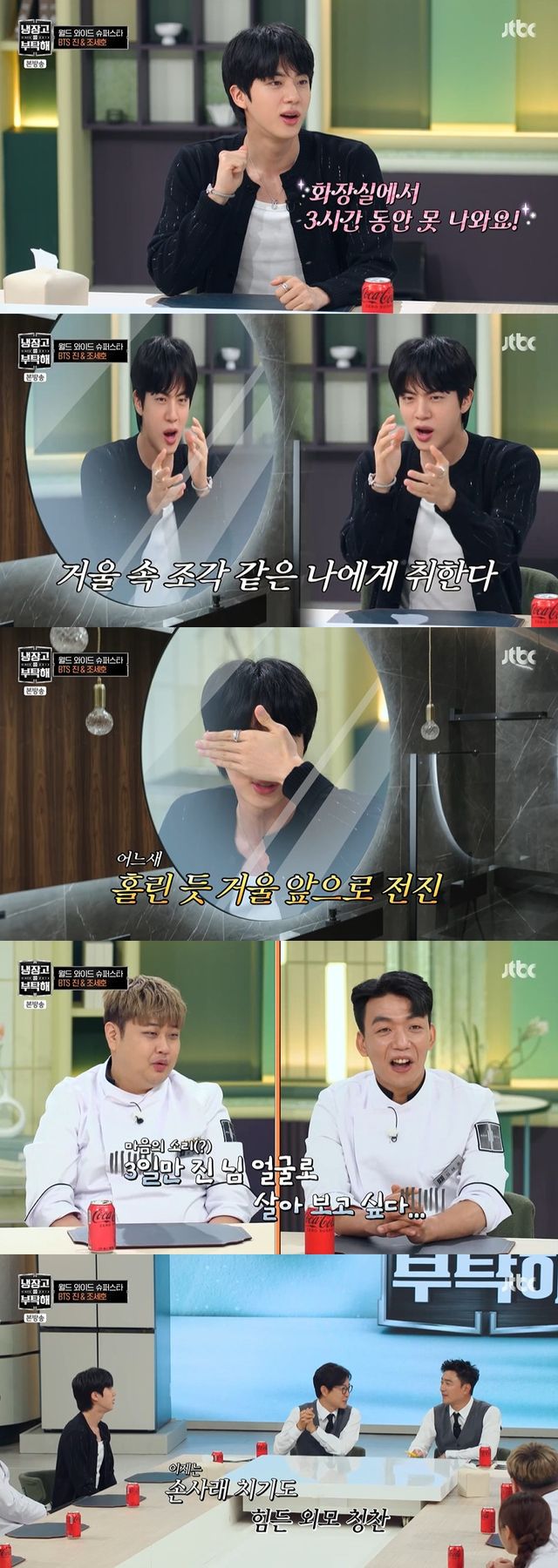 20일 방송된 JTBC '냉장고를 부탁해'(이하 '냉부해')에서는 '월드 와이드 핸섬' BTS 진과 풋풋한 신혼 생활 중인 '사랑꾼' 조세호가 게스트로 출연했다.