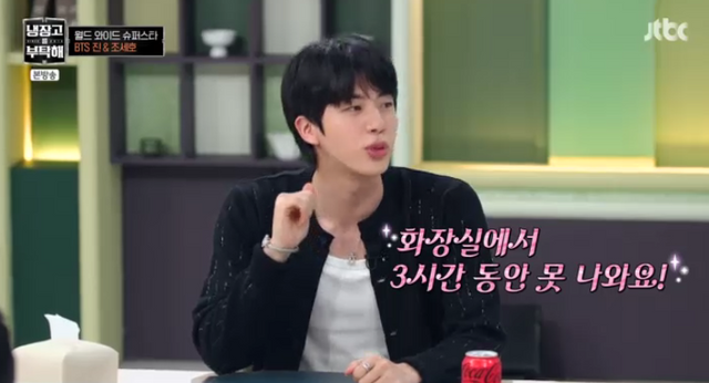 이에 진은 “아침에 샤워를 하고 화장실에서 3시간 동안 못 나온다. 거울을 보고 있으면 조각 같은 얼굴이 앞에 있지 않냐”며 너스레를 떨었다. 이어 “처음에는 멀리서 보다가 점점 가까이 다가간다”고 덧붙여 웃음을 자아냈다.