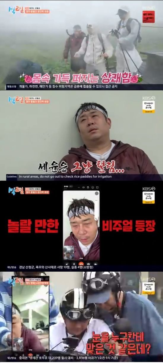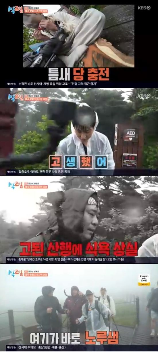 그 시각 한라산으로 떠난 백록샘 팀의 문세윤, 이준, 딘딘은 빗방울이 얼굴을 때리는 비바람에 힘들어 했다.