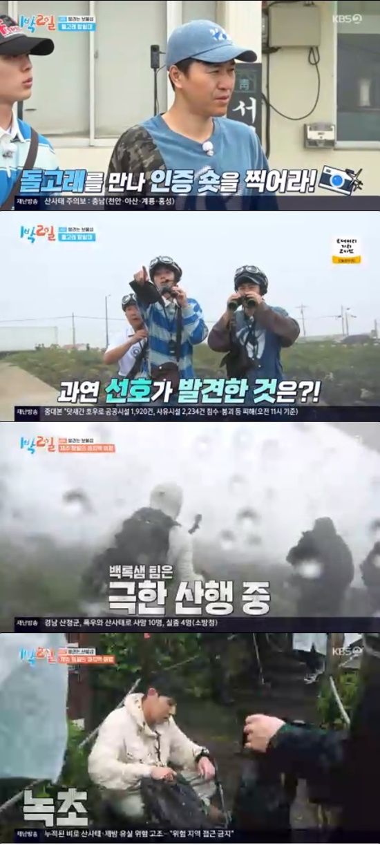 20일 방송된 KBS 2TV '1박 2일 시즌4'에서는 김종민, 문세윤, 조세호, 이준, 딘딘, 유선호가 두 팀으로 나뉘어 백록샘, 돌고래 탐험에 나서는 모습이 전파를 탔다.