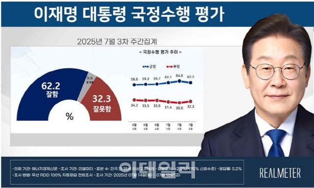 21일 여론조사기관 리얼미터에 의해 실시된 7월 3주차 주간 여론조사에 따르면, 이 대통령은 국정 수행 증정 평가는 전주보다 2.4%포인트 줄어든 62.2%로 나타났다. ‘매우 잘하고 있다’는 응답은 51.9%, ‘잘하는 편’이라는 응답은 10.3%였다.