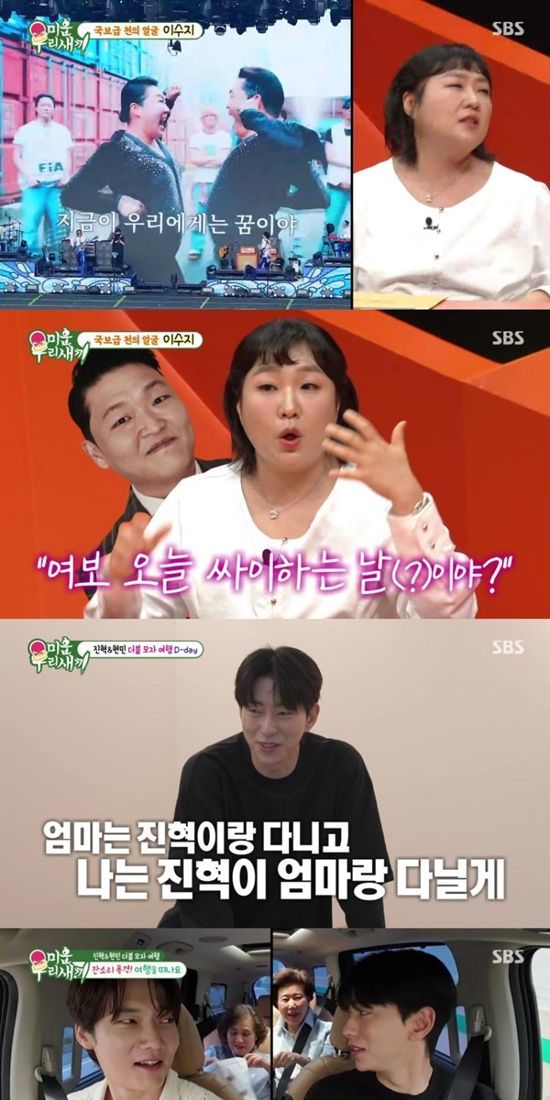 이날 스튜디오에는 '국보급 천의 얼굴' 코미디언 이수지가 스페셜 MC로 출연해 격한 환영을 받았다. 얼굴을 알리게 된 계기가 된 '전화받는 어머님' 연기를 선보여 스튜디오를 웃음바다로 만든 이수지는 "얼마전 콘서트에 출연하게 되어 싸이 형님 의상을 입었는데 바지가 저한테 작더라. 연예인이라 보기보다 왜소하시구나 느꼈다"라고 충격받은 사연을 전했다.