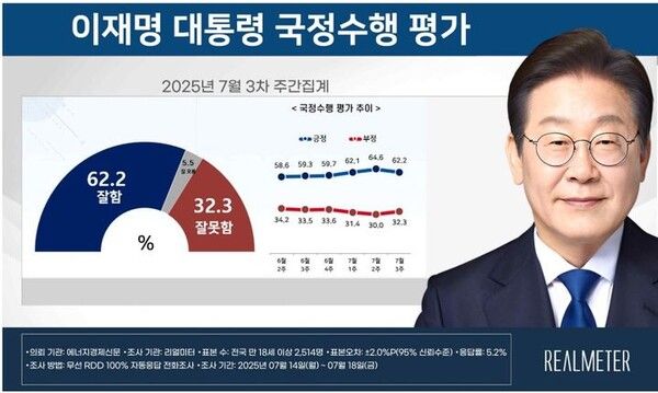 이재명 대통령의 국정수행에 대해 '잘한다'는 긍정 평가는 62.2%, '잘못한다'는 부정 평가는 32.3%라는 여론조사 결과가 21일 발표됐다.