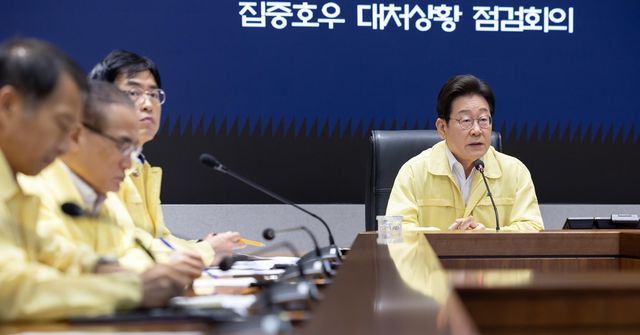 이재명 대통령이 18일 정부서울청사 중앙재난안전상황실 서울상황센터에서 집중호우 대처상황 점검회의를 주재하고 있다. / 뉴스1