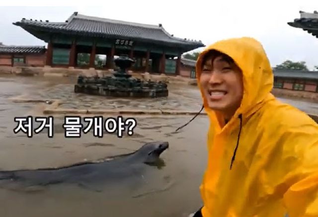 한 영상에는 노란 우비를 입은 남성이 “경복궁이 완전히 물에 잠겼다”고 말하며 뒤로는 바지를 걷은 사람들이 양동이로 물을 퍼낸다. 그러다 잠시 후 갑자기 물개가 물에 잠긴 궁내를 수영하는 모습이 나타난다.