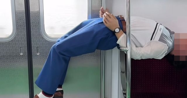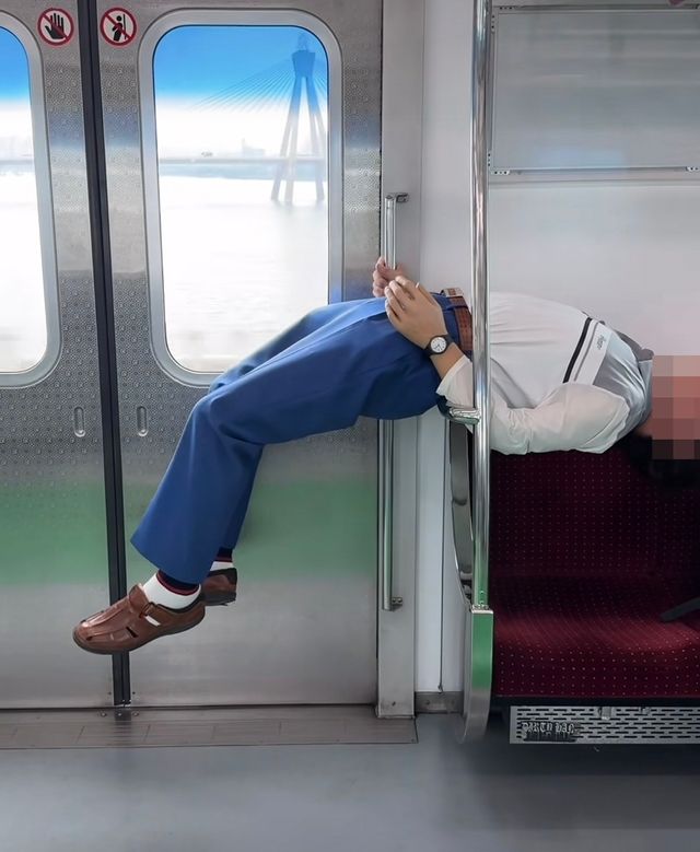 다리는 공중에 뜬 채로 차량 출입문에 기댄 모습이다. 마치 퍼포먼스 아트라도 하듯 극단적인 자세지만 옆 승객과의 거리, 안전 문제를 전혀 고려하지 않은 민폐 행동이다.