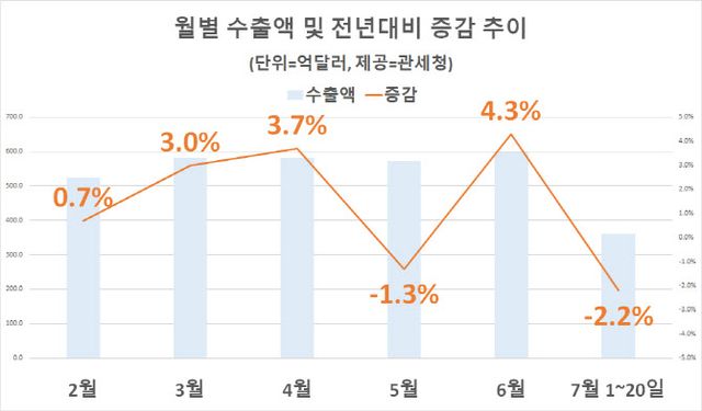 관세청은 7월 1~20일 수출액이 360억 7000만달러(약 50조 2000억원·통관기준 잠정)로 전년대비 2.2% 감소했다고 21일 밝혔다.
