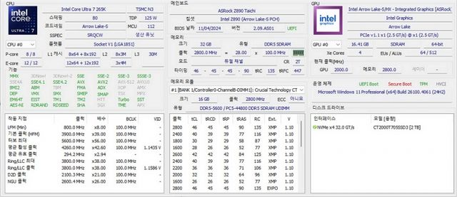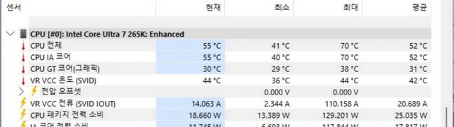 ▲ 풀로드 스트레스 동안 Intel Core Ultra 7 265K(TDP 125W)를 탑재한 시스템에서 발열 제어 능력은 인상적이다. 센서 로그를 기준으로 CPU 패키지 온도는 최소 41°C, 평균52°C, 최고 70°C 범위 안에서 안정적으로 머물렀다. IA 코어 역시 동일한 온도 분포(40°C– 70°C, 평균 52°C)를 기록했으며, VRM 영역은 36°C–44°C(평균42°C)로 낮게 유지됐다.