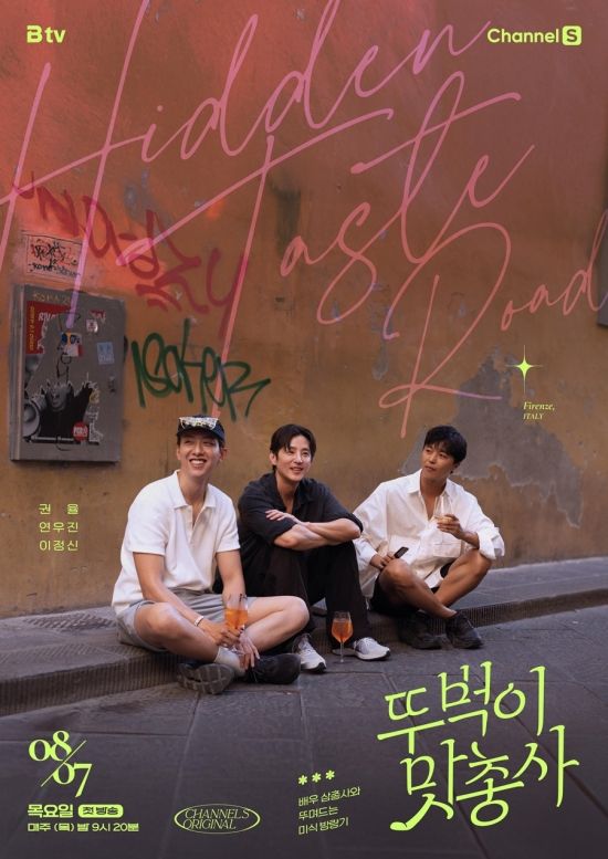 그에 이어 '뚜벅이 맛총사'는 보기만 해도 흐뭇한 미소를 자아내는 권율, 연우진, 이정신의 '화보 같은' 여행 사진을 메인 포스터로 공개하며 기대감을 끌어올렸다. 편안한 복장의 세 사람은 피렌체의 한 골목을 '카페' 삼아, 바닥에 앉아 음료를 마시며 여행의 낭만을 만끽하고 있다. 그들의 뒤로는 세월의 흔적이 느껴지는 어느 건물 벽에 누군가 그려놓은 낙서와 'Hidden Taste Road'라고 흘려쓴 필체의 문구가 자유로운 도시의 감성을 더한다. '뚜벅이 맛총사'의 정체성을 담은 '배우 삼총사와 뚜며드는 미식 방랑기'라고 쓰여진 개성 넘치는 문구 또한 시선을 강탈한다.