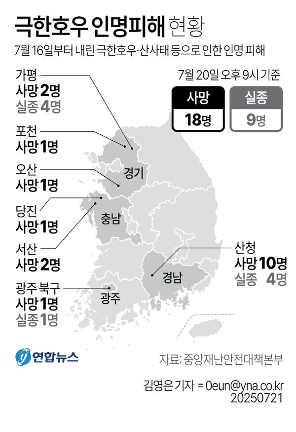 21일 행정안전부 국민안전관리 일일상황보고에 따르면 전날 오후 9시 기준 전국에 내린 극한호우로 인해 사망자가 18명, 실종자가 9명 발생했다. 실종자는 9명이었다.