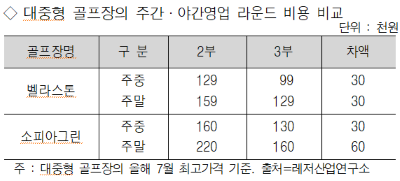 수도권 대중형 골프장인 소피아그린CC(경기도 여주)에서도 야간라운드를 하면 3만~6만원 절약할 수 있다. 한국교직원공제회가 운영하고 있는 이 골프장의 7월 주간 그린피는 주중 16만원, 주말 22만원이지만 야간에는 주중 13만원, 주말 16만원이다.