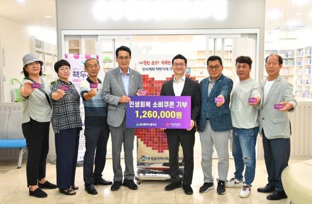 이순걸 군수는 이날 온양읍 행정복지센터에서 선불카드 수령 후 온양읍 단체장들과 함께 사회복지공동모금회에 총 126만원 상당의 소비쿠폰을 기부했다.