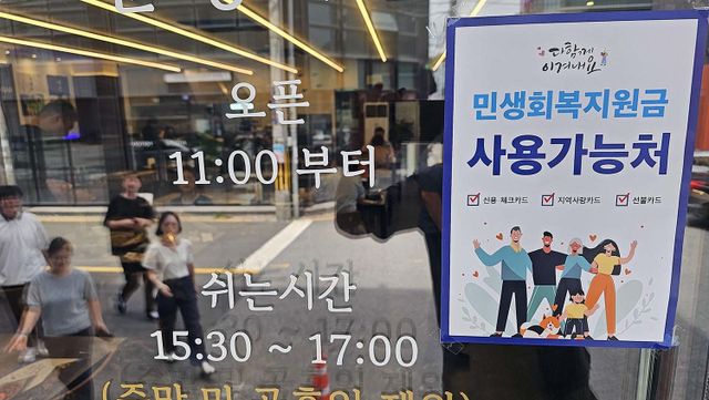민생회복 소비쿠폰 신청 첫 날인 21일 경북 포항시청 앞에 있는 식당 정문에 소비쿠폰 사용처를 알리는 안내문이 붙어있다. / 뉴스1
