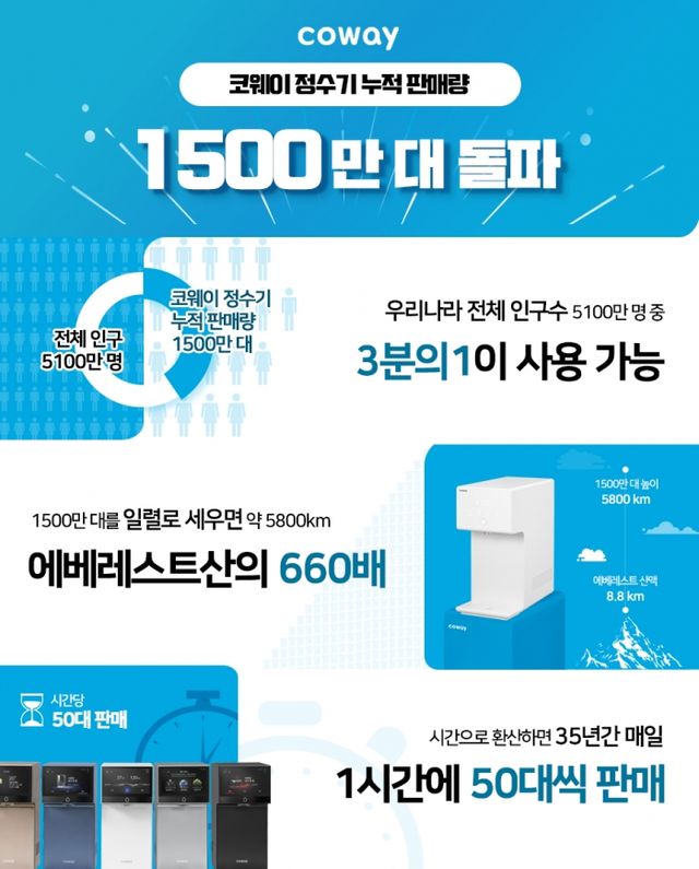 코웨이 관계자는 "35년 넘게 이어져온 고객들의 신뢰 덕분에 누적 1500만 대 판매라는 상징적 성과를 이뤄낼 수 있었다"며 "앞으로도 대한민국 정수기의 역사이자 글로벌 물 산업의 선구자라는 자부심을 갖고 고객의 삶을 더 건강하고 풍요롭게 만들기 위한 혁신을 멈추지 않겠다"고 말했다.