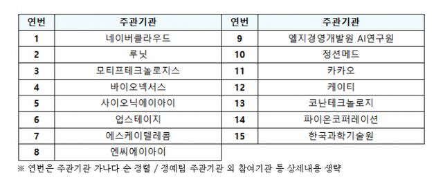 21일 업계에 따르면 과학기술정보통신부(이하 과기정통부)가 실시하는 독자 AI 파운데이션 모델 개발사업에 ▲LG AI연구원 ▲SK텔레콤 ▲KT ▲카카오 ▲네이버클라우드 ▲NC AI 등 대기업과 ▲루닛 ▲업스테이지 ▲코난테크놀로지 ▲한국과학기술연구원(KAIST) 등 강소기업을 포함해 총 15개 기업이 컨소시엄에 참여했다.
