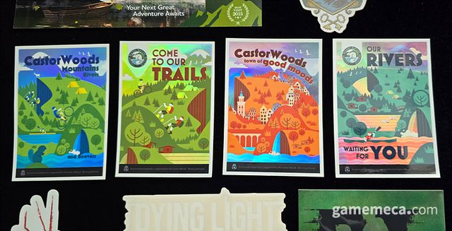 ▲ 가방 안에는 캐스터 우즈의 환경을 담은 여러 엽서와 스티커, 팔찌 등 다양한 굿즈가 있다 (사진: 게임메카 촬영)