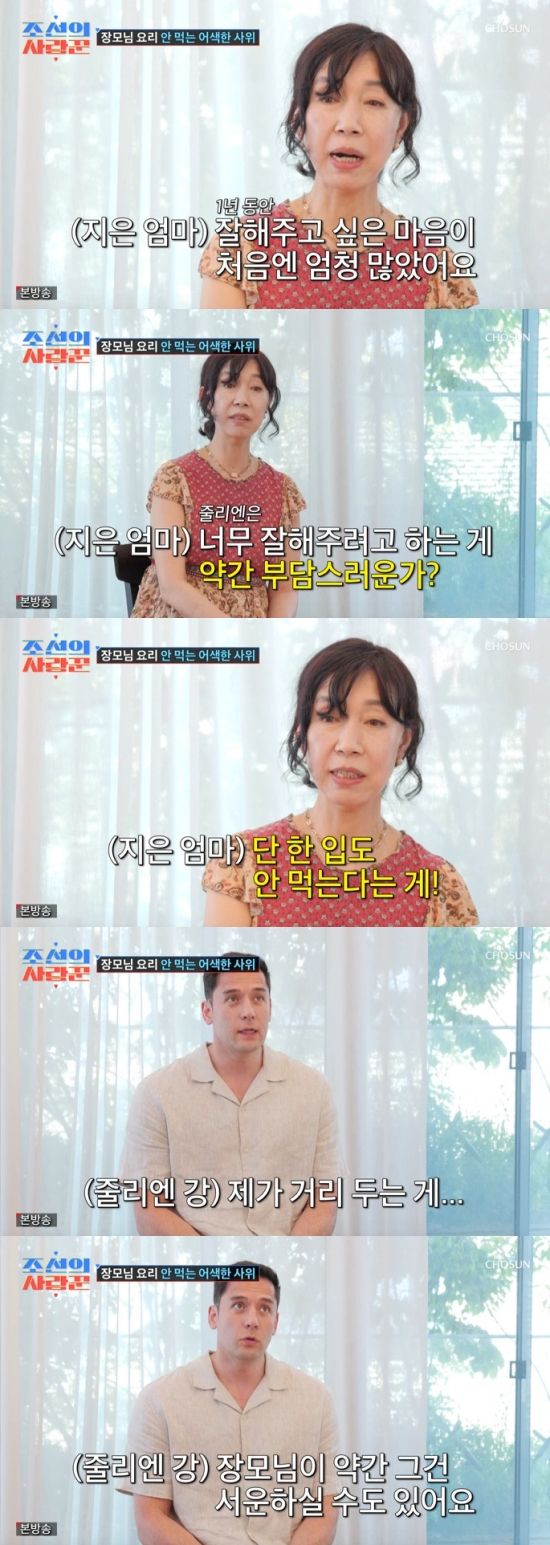 결국 제이제이 어머니는 "사위 사랑은 장모라고 하지 않냐. 그래서 저는 정말 잘해주고 싶은 마음이 엄청 많았다. 그러면 줄리엔은 (반응이) '잘해주려고 하는 게 부담스러운가?' 그런 생각이 들더라. 밥도 잘 먹을 줄 알고 했는데 단 한 입도 안 먹는다는 게 너무 속상했다. 그들 부부 생활에 깊숙이 저도 관여 안 하고 싶고 제가 안 끼어도 밥도 잘 해먹고 살 수 있을 거 같고 생각해 봐야겠다"라며 서운함을 드러냈다.